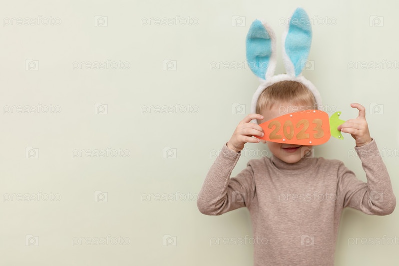 Забавный мальчик в образе кролика держит морковку с цифрами Нового 2023 года на светлом фоне с местом для копирования. Концепция Нового года