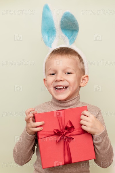 Счастливый мальчик в образе кролика держит красную подарочную коробку на светлом фоне с местом для копирования. Концепция Нового года