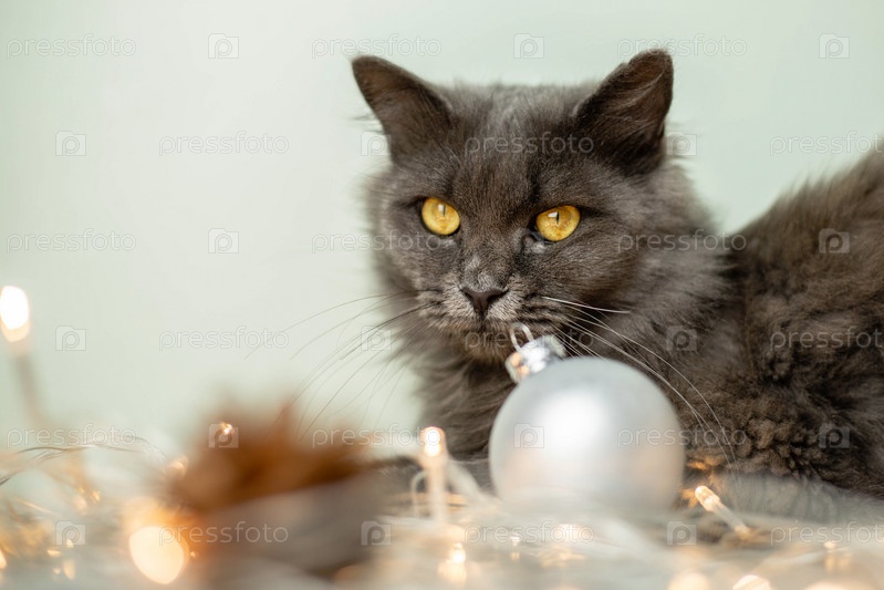 Серый пушистый кот с желтыми глазами смотрит в камеру на светлом фоне с гирляндами, елочными игрушками и шишками. Концепция Нового года и Рождества. Копировать пространство