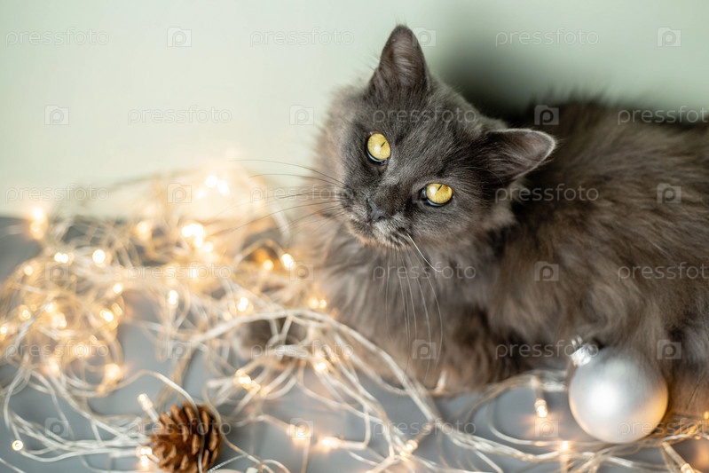 Серый пушистый кот с желтыми глазами смотрит в камеру на светлом фоне с елочными игрушками, гирляндами и шишками. Вид сверху. Концепция Нового года и Рождества. Копировать пространство