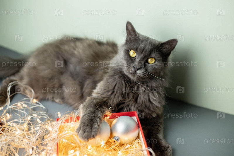 Серый пушистый кот играет с елочными игрушками в красной подарочной коробке и с гирляндой. Концепция Нового года и Рождества