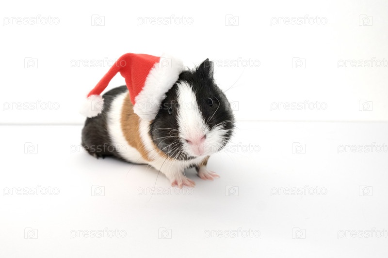 Морская свинка в красной шапке Санта-Клауса на белом фоне. Грызун, домашнее животное. Концепция Рождества и Нового года
