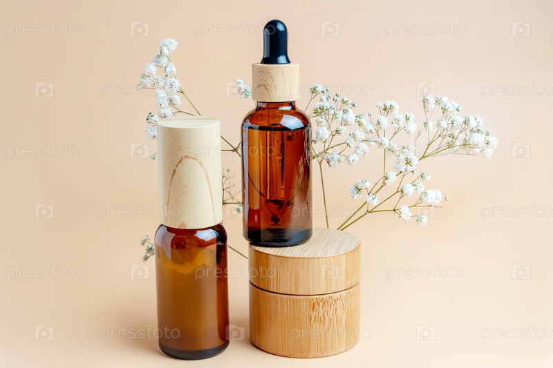 Уход за кожей Антивозрастная косметика. Сыворотка, крем и эссенция для лица в упаковке из темного стекла и бамбука. Органическая концепция