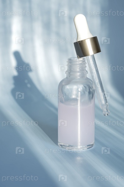 Стеклянная бутылка-капельница с косметической сывороткой, гиалуроновой кислотой и витаминами на синем фоне с модными жесткими тенями. Домашняя косметика и спа-концепция