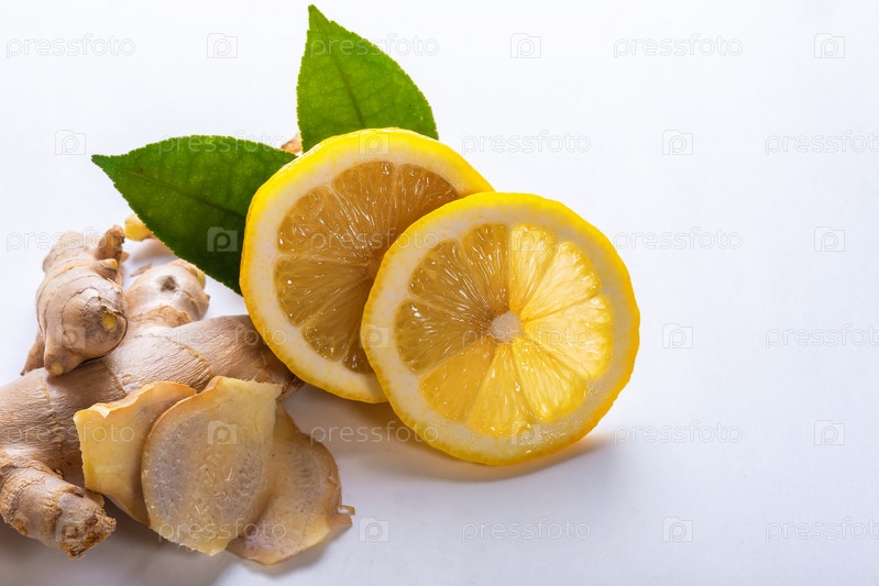 Имбирь с лимоном и зелеными листьями лимона и мяты на белом фоне