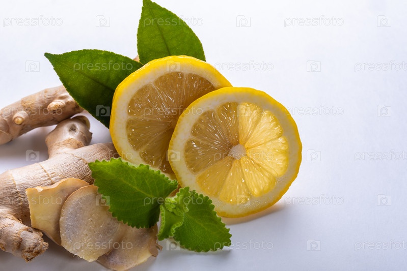 Имбирь с лимоном и зелеными листьями лимона и мяты на белом фоне