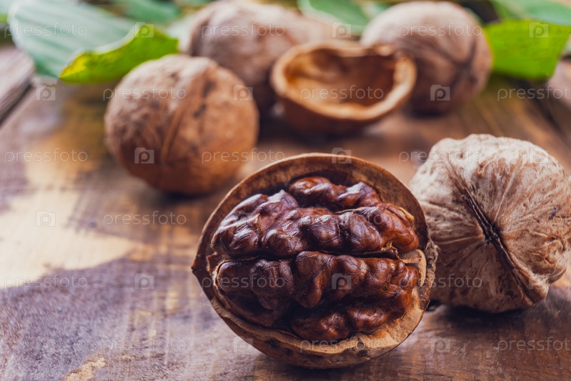 Грецкий орех, целый и очищенный от кожуры, и листья на заднем фоне
