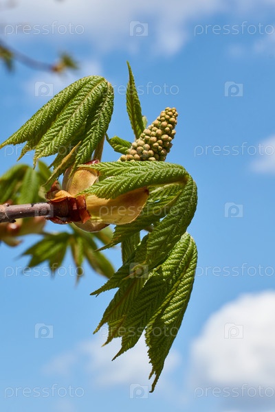 Весна. Бутоны каштана цветут на городской площади