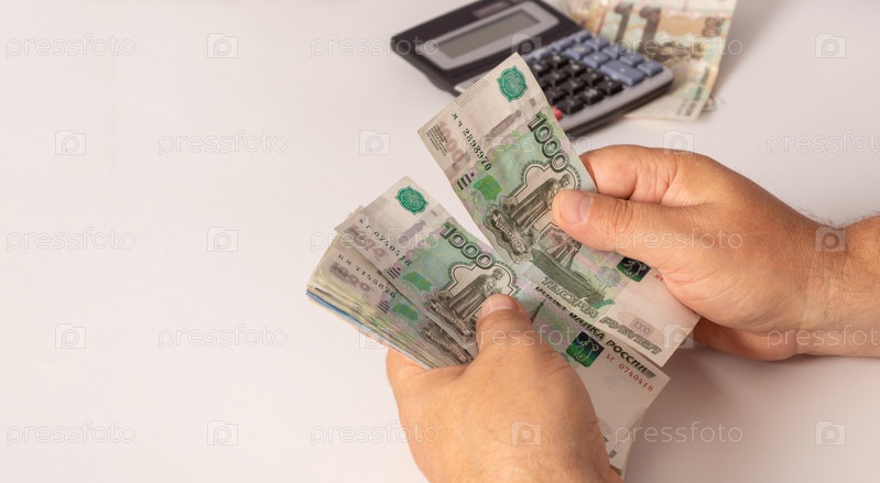 Наличные бумажные деньги в руках мужчины. Калькулятор и мелкие купюры на заднем плане