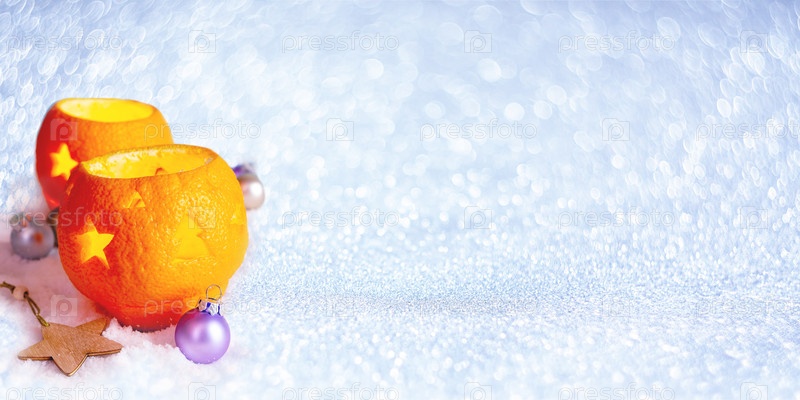 Рождественские украшения, оранжевый подсвечник и шары. Светлый новогодний фон с блестками боке