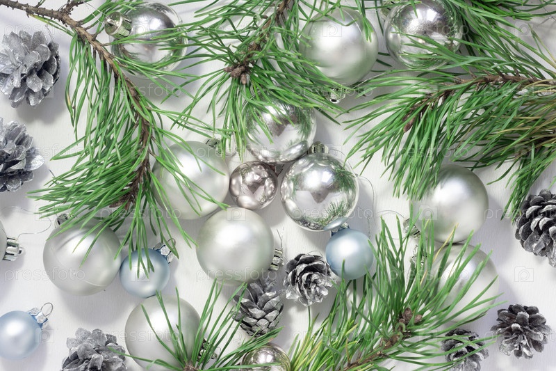 Легкий новогодний фон с серебряными шарами, шишками и сосновыми ветвями на белом. празднование Нового года