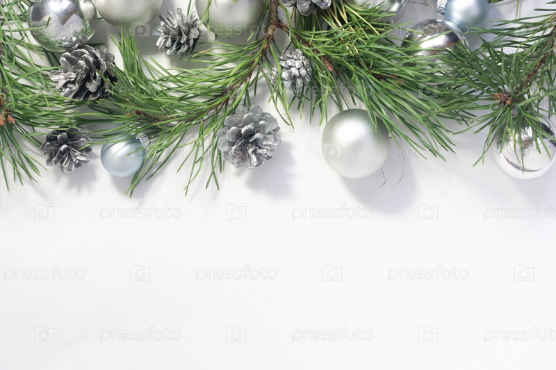 Светлый новогодний фон с серебряными шарами, шишками и сосновыми ветвями на белом фоне. празднование Нового года