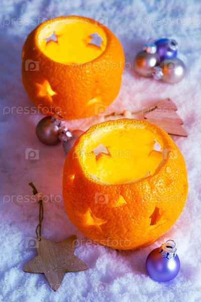 Новогодняя композиция с оранжевыми подсвечниками и декоративными шарами на снегу. Празднование Рождества