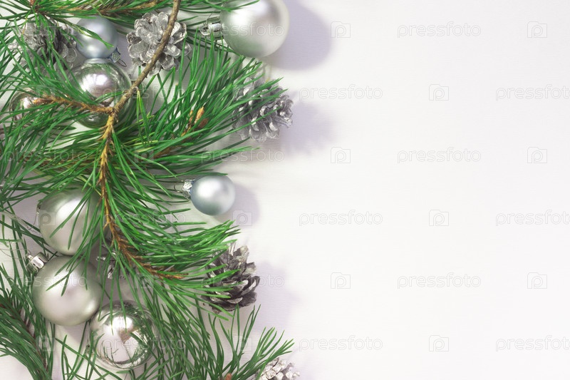 Светлый новогодний фон с серебряными шарами, шишками и сосновыми ветвями на белом фоне. празднование Нового года