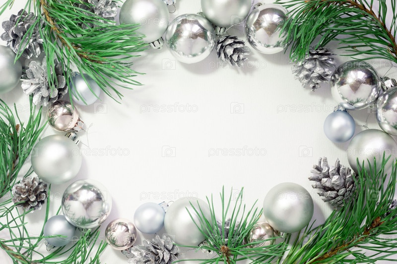 Светлый новогодний фон с серебряными шарами, шишками и сосновыми ветвями на белом фоне. празднование Нового года