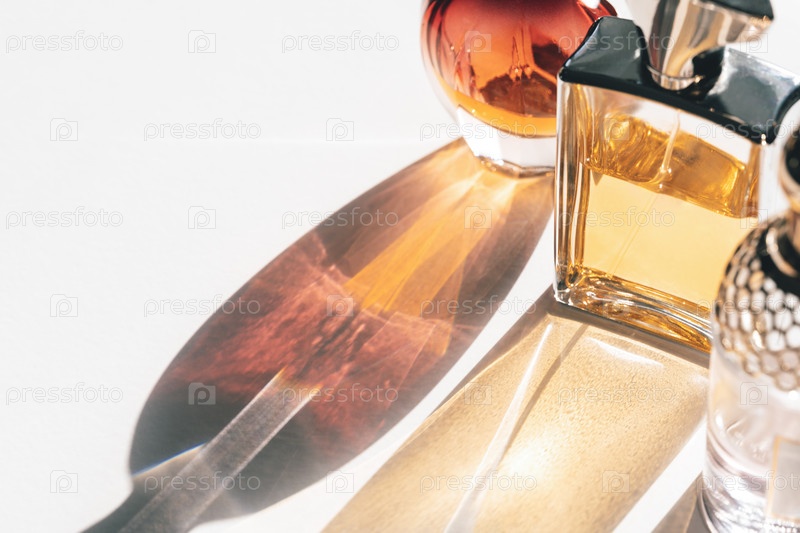 Набор флаконов духов с длинными тенями от солнечного света на белом фоне, выборочный фокус