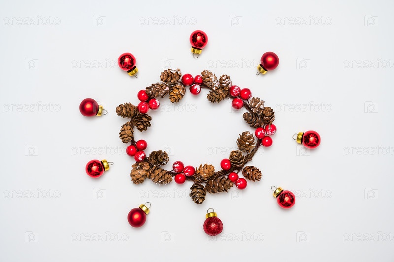 Рождественские украшения, венок из сосновых шишек и рождественские шары на белом фоне. Рождественская открытка минимализм