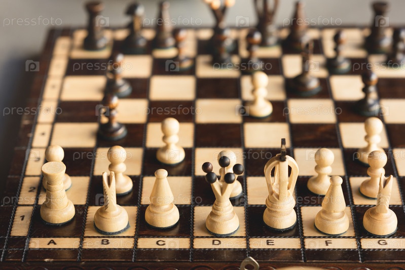 Деревянная шахматная доска и шахматные фигуры на ней. Интеллектуальная настольная игра, выборочный фокус