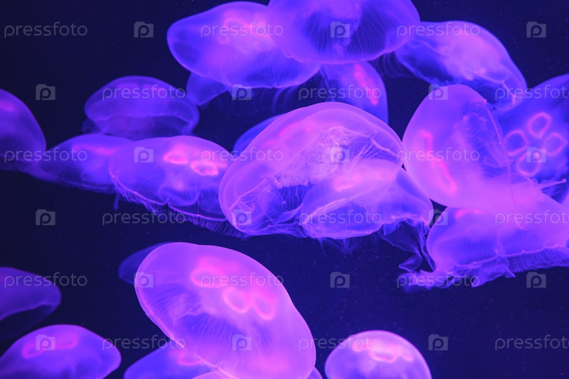 Стая медуз под водой в неоновом свете. Естественный абстрактный фон для дизайна