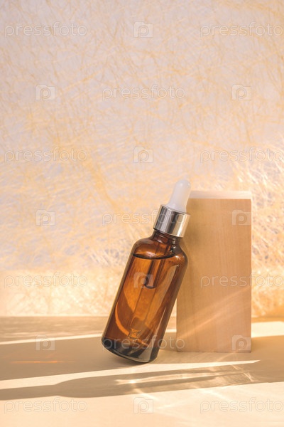 Бутылка из янтарного стекла с увлажняющей сывороткой для лица рядом с деревянным подиумом по вертикали, жесткий свет и тень. Косметические продукты, концепция ухода за лицом и телом