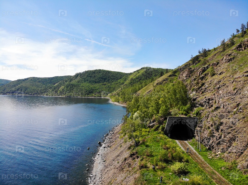 Старый каменный арочный тоннель в горной скале на Кругобайкальской железной дороге летом. Байкал с воздуха