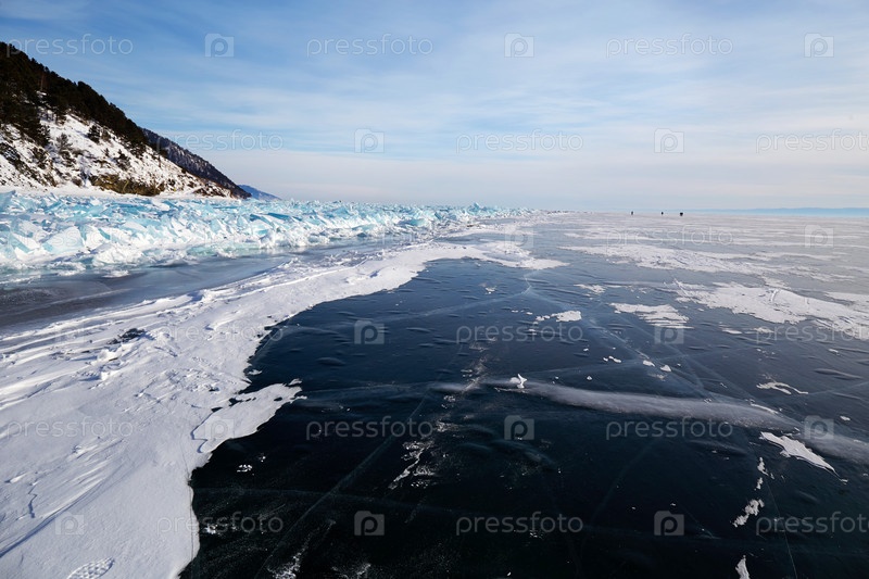 Замерзшее озеро Байкал. Поля ледяных торосов у берега и бескрайние просторы чистого прозрачного льда