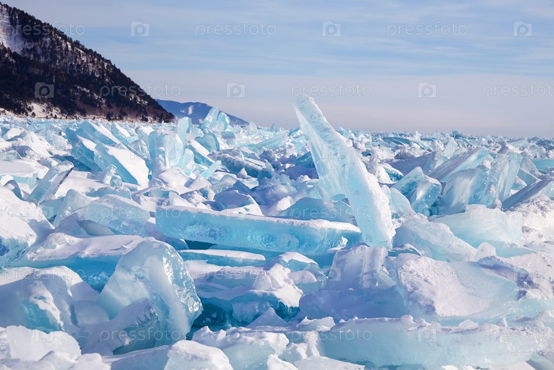 Красивый пейзаж замерзшего озера Байкал в солнечный зимний день. Кучи осколков голубого льда, покрытых снегом