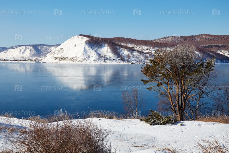 Красивый зимний пейзаж. Заснеженные горы отражаются в незамерзшей Ангаре