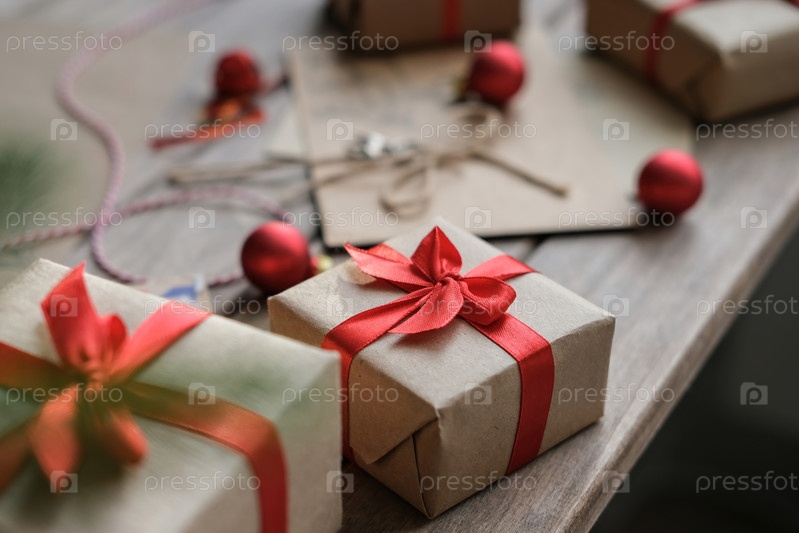 Подарочные коробки с красными лентами. Подготовка к Рождеству. Рождественская распродажа