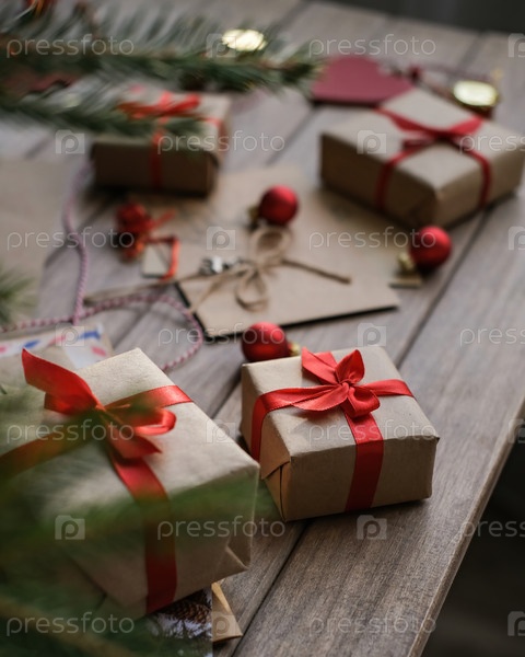 Подарочные коробки с красными лентами. Подготовка к Рождеству. Рождественская распродажа