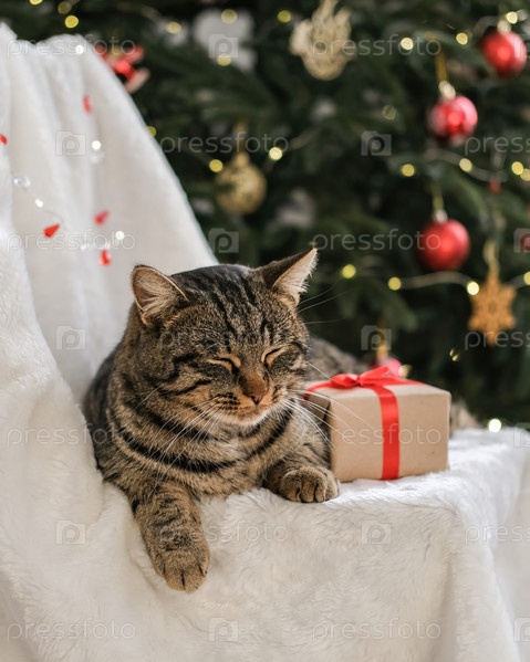Рождественский кот. Полосатый кот с рождественским подарком на фоне елки