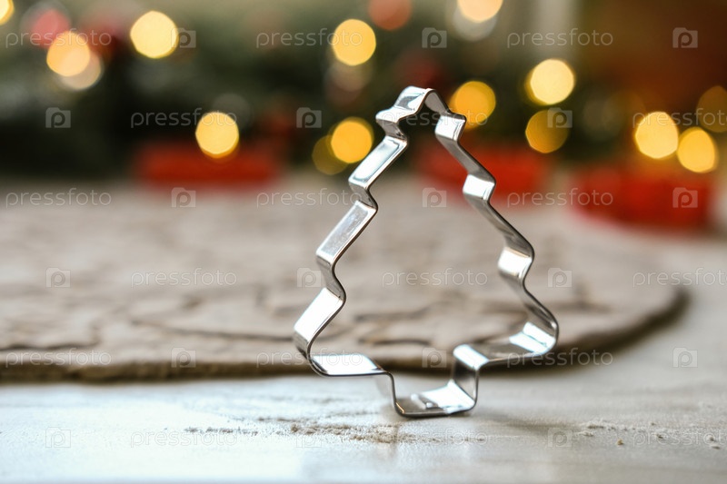 Металлическая форма елки на фоне пряничного теста и рождественских огней