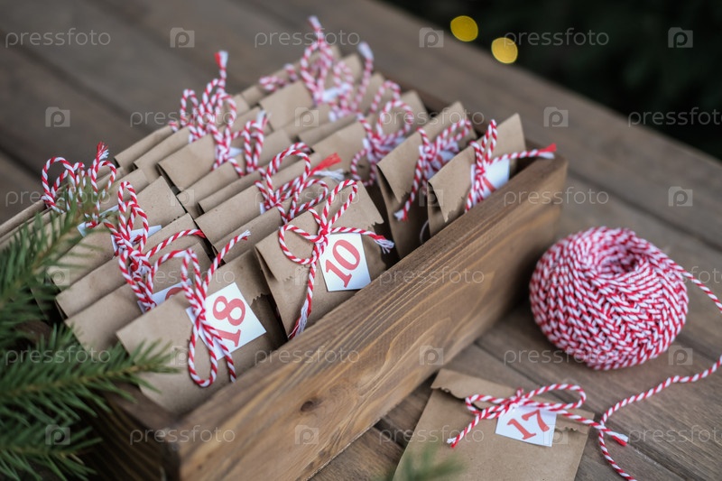 Подготовка к Рождеству. Рождественский адвент-календарь. Эко бумажные крафт-пакеты с небольшими подарками в деревянной коробке. Экологичный стиль. Экологически чистое Рождество