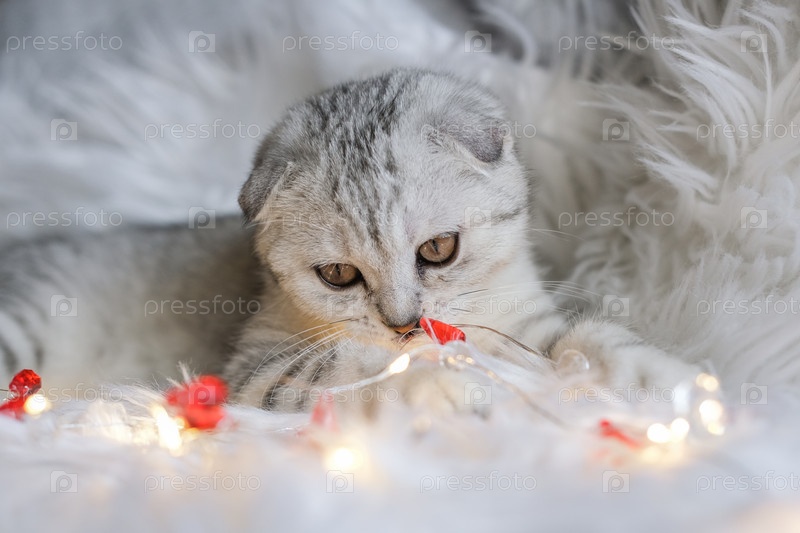 Рождественский кот. Симпатичный шотландский вислоухий котенок и рождественская гирлянда на белом пушистом пледе