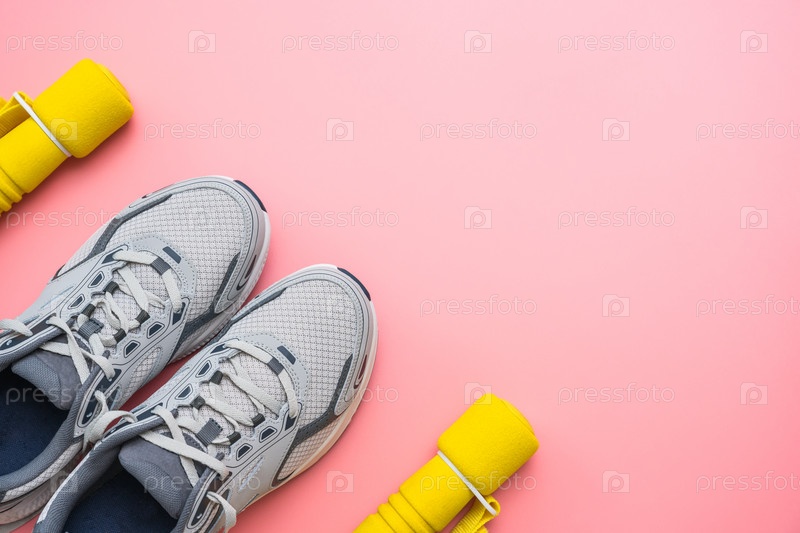 Серые кроссовки и желтые гантели на розовом фоне, вид сверху, фитнес-концепция