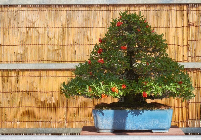 Дерево бонсай пираканты на выставке бонсай замка Нагоя. Нагоя. Япония