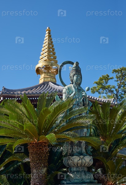 Статуя Каннон и изогнутая крыша пагоды с золотым сорином в храме Иссиндзи. Тенноджи. Осака. Япония