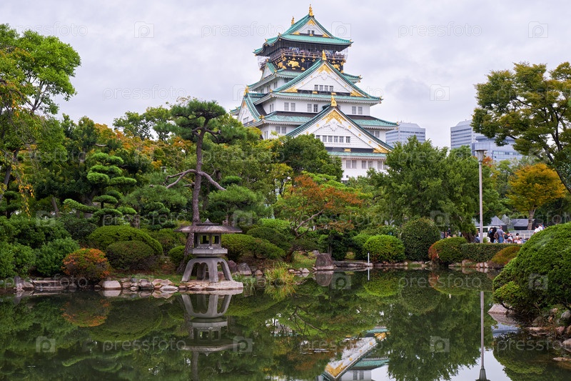 Традиционный японский сад во внутреннем дворе Осакского замка. Япония
