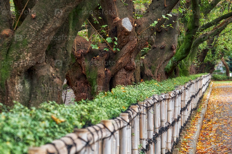Стволы старых вишневых деревьев, растущих вдоль бамбукового забора в парке замка Нагоя. Нагоя. Япония