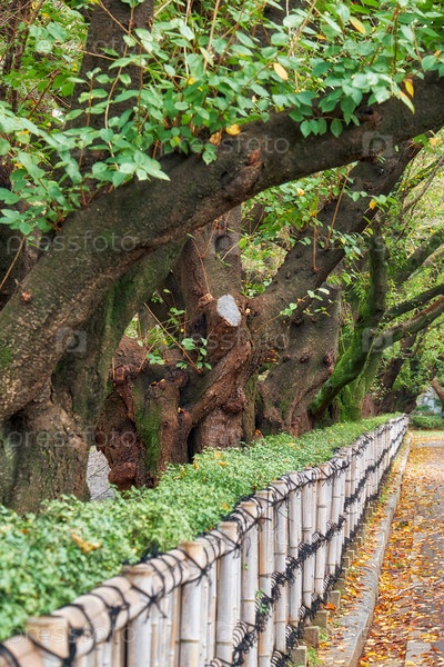 Стволы старых вишневых деревьев, растущих вдоль бамбукового забора в парке замка Нагоя. Нагоя. Япония