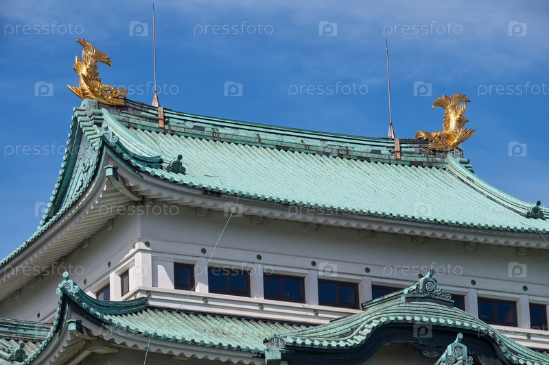 Два золотых шати (киншачи) по обеим сторонам самой верхней крыши замка Нагоя. Нагоя. Япония