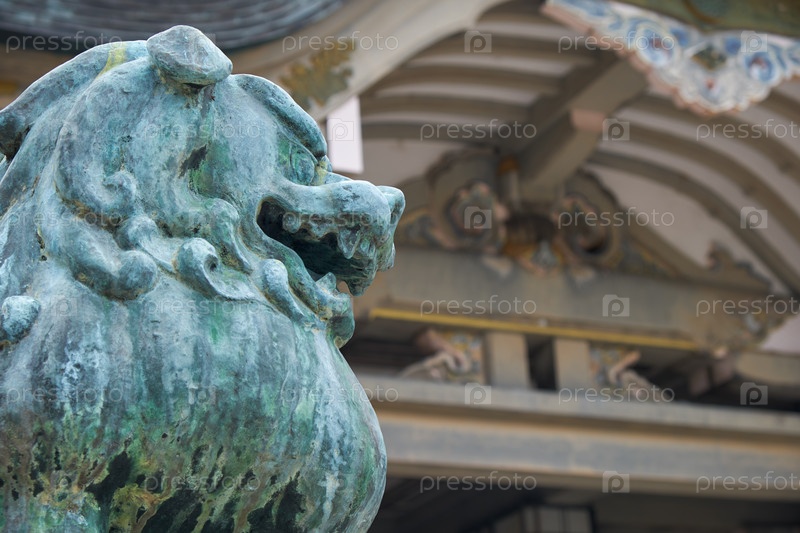 Львиная собака А-ге Комаину охраняет вход в святилище Хококу. Осакский замок. Япония