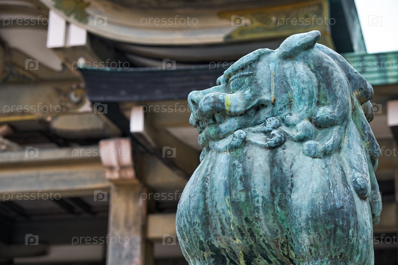 Львиная собака Ун-ге Комаину охраняет вход в святилище Хококу. Осакский замок. Япония