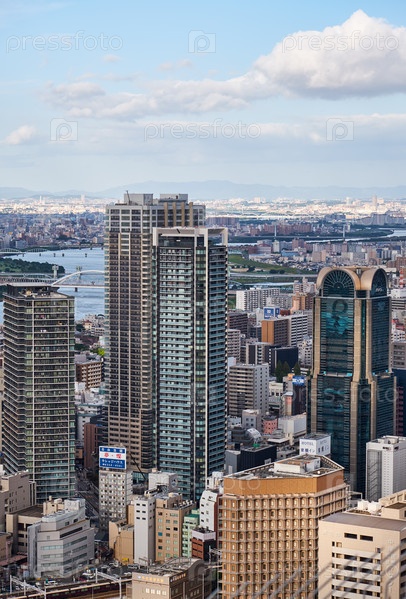 Вид с высоты птичьего полета на небоскребы в центре города Кита на фоне реки Йодо. Осака. Япония