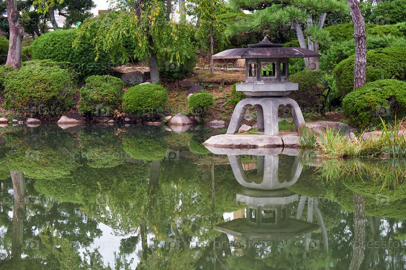 Каменный фонарь Юкими-доро в саду замка в Осаке. Осака. Япония
