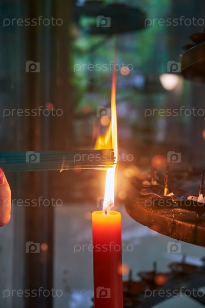Пучок ароматических палочек зажигается от свечи, горящей в подсвечнике в японском храме. Япония