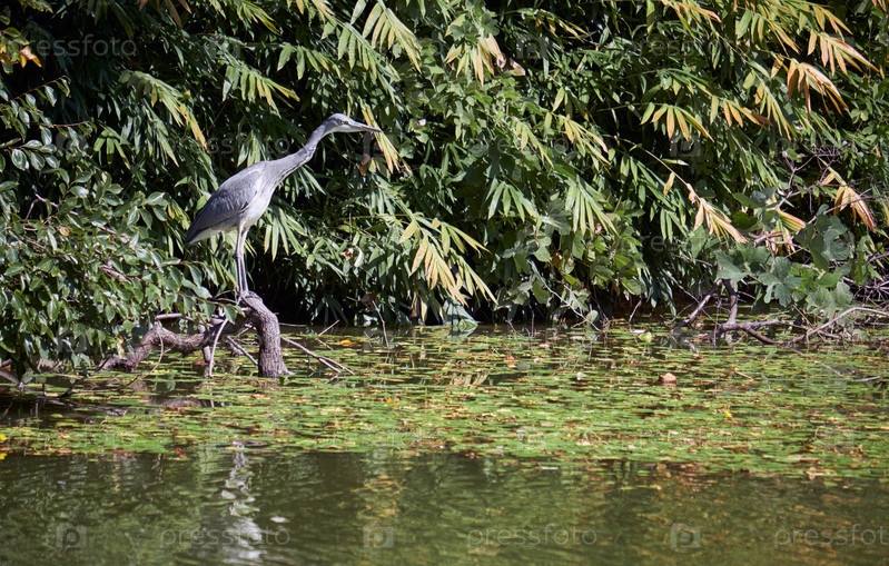 Молодая серая черепаха (Ardea cinerea) ищет пищу в прудовой воде