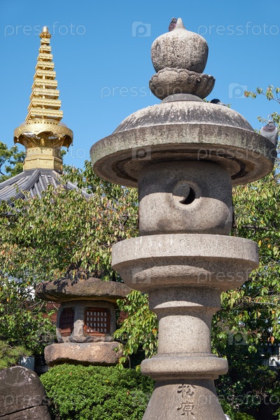 Традиционные каменные фонари с пагодой сорин на заднем плане в храмовом саду. Осака. Япония