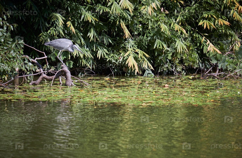 Молодая серая черепаха (Ardea cinerea) ищет пищу в прудовой воде