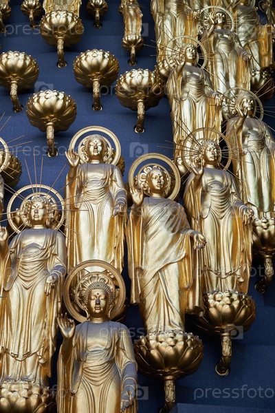 Золотые статуи Будд в зале Сандзэнбуцу-до. Храм Иссиндзи. Осака. Япония